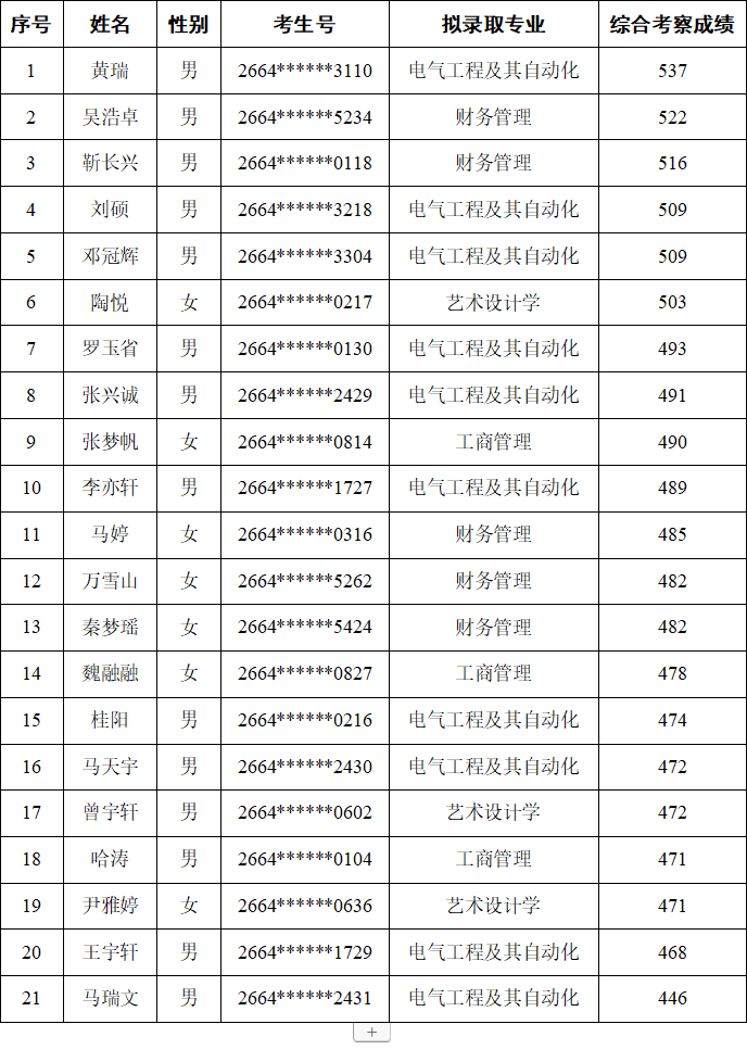 根据《自治区教育厅关于印发<宁夏回族自治区高等职业教育分类招生考试改革实施方案(修订)>的通知》及《宁夏回族自治区2026年高等职业教育对口招生工作实施办法》相关要求,经考生申请、生源学校推荐、教育主管部门审核等环节,学校按照《银川科技学院关于开展2026年本科专业招生免试中职毕业生综合考察面试的通知》中相关内容,于2026年3月9日下午对符合免试录取条件的考生进行了现场面试综合考察。结合考生综合考察情况及成绩,经学校招生工作领导小组研究,确定学校最低录取资格线为445分,现对考核成绩合格的学生名单予以公示。