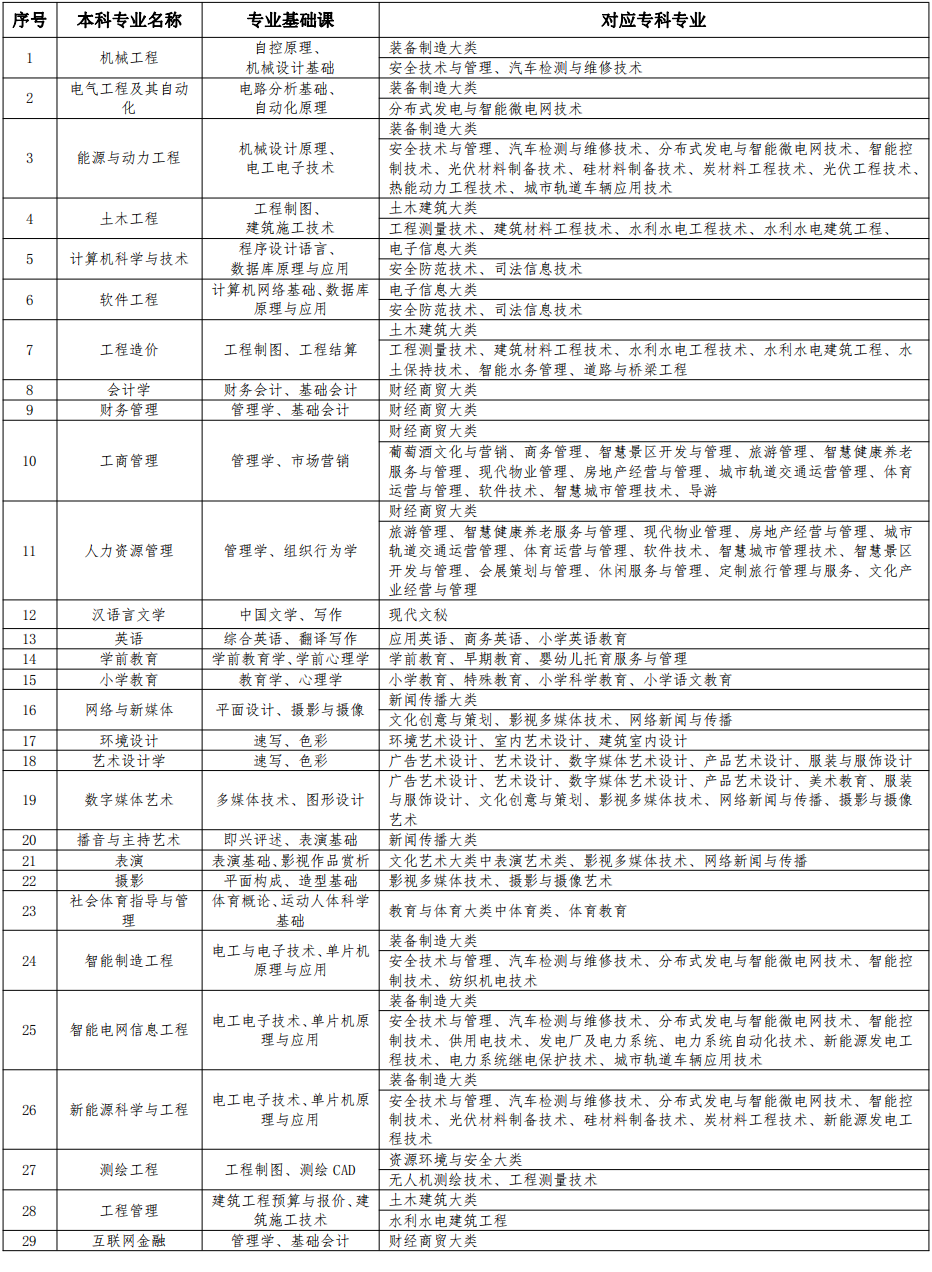 第十条 学校按照教育主管部门核准的年度招生规模,结合学校办学条件、历年招生情况,本着优化生源结构、促进区域均衡的原则,综合考虑国家政策导向、学校定位、教学质量和办学条件等因素,坚持以就业为导向,合理安排招生专业及各专业计划数,所有专业均文理兼招。学校2026年专升本招生专业、各专业基础课及对应专科专业如下表: